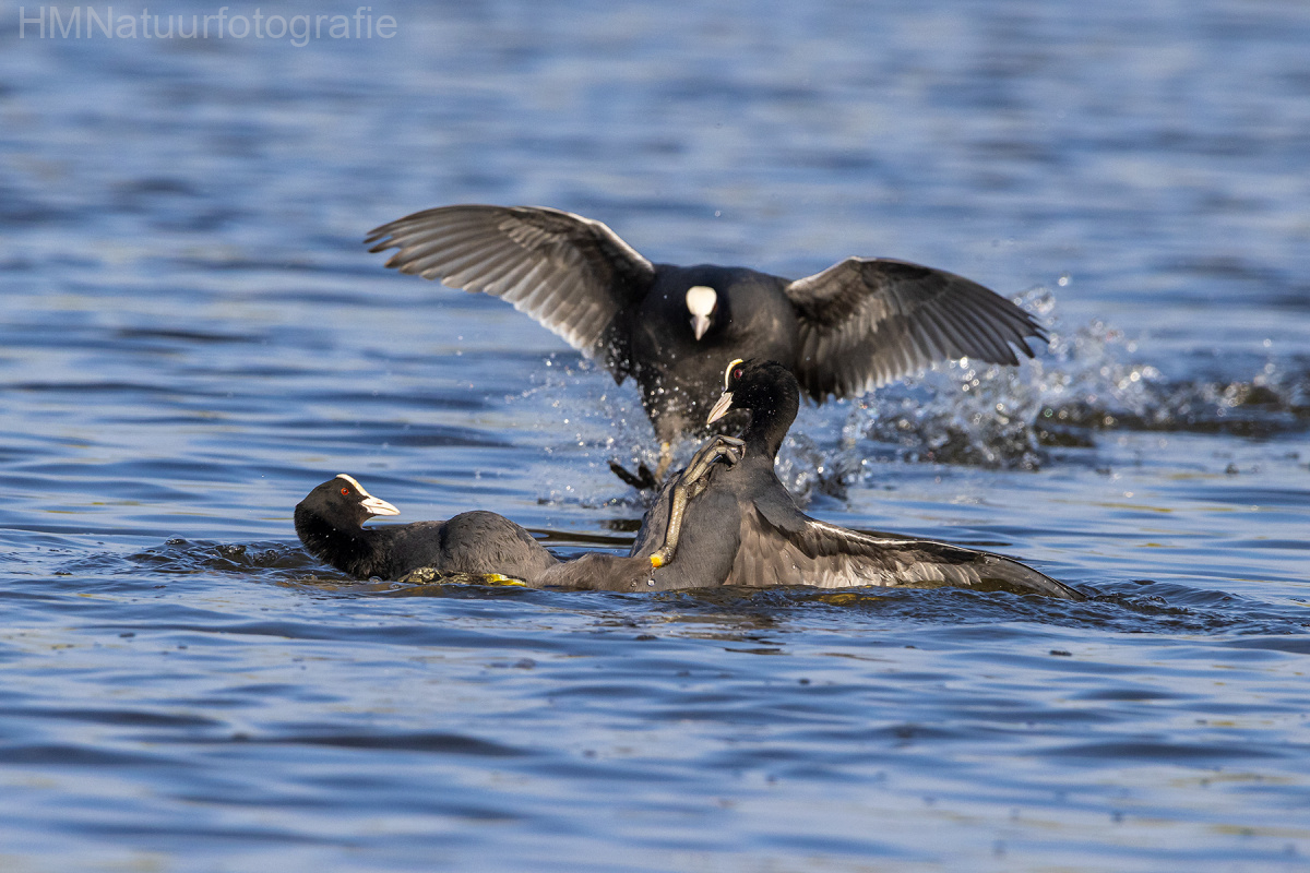 De Meerkoet is familie van de rallen en is veel in vijvers van parken aan te treffen. De zwarte vogel met de witte bles en snavel is eenvoudig tussen de andere watervogels te herkennen. Meerkoet Afbeelding 3 van 8 territoriumstrijd 3