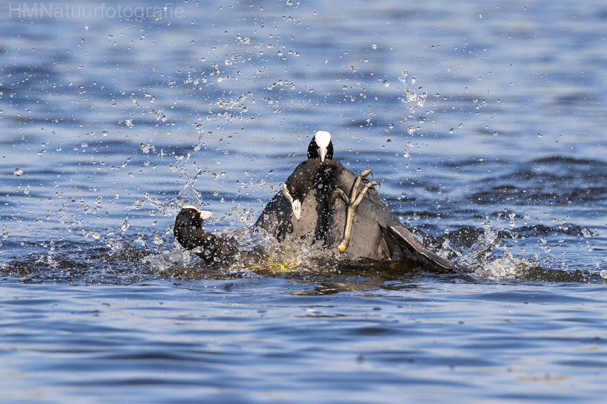 De Meerkoet is familie van de rallen en is veel in vijvers van parken aan te treffen. De zwarte vogel met de witte bles en snavel is eenvoudig tussen de andere watervogels te herkennen. Meerkoet Afbeelding 7 van 8 territoriumstrijd 7