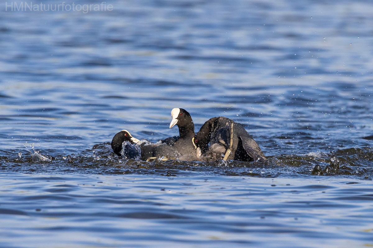 De Meerkoet is familie van de rallen en is veel in vijvers van parken aan te treffen. De zwarte vogel met de witte bles en snavel is eenvoudig tussen de andere watervogels te herkennen. Meerkoet Afbeelding 8 van 8 territoriumstrijd 8
